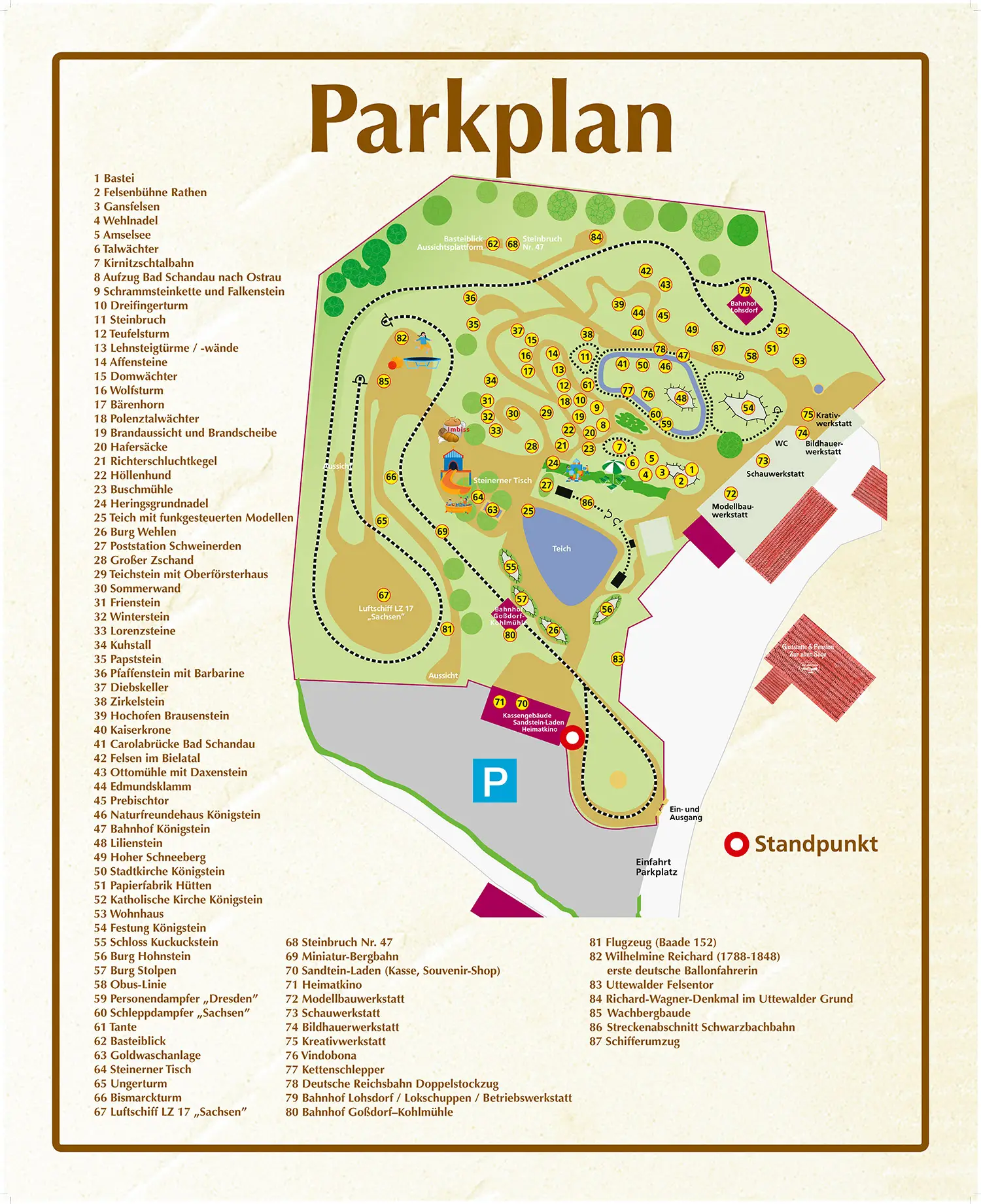 Erlebnisbereiche: Miniatur-Bergbahn mit Bahnhof und Lokschuppen, Teich mit funkferngesteuerten Schiffsmodellen, Goldwaschanlage, Bildhauer-Schauwerkstatt, Kreativwerkstatt, Herstellung Kunsthandwerk aus Sandstein, Modelbauwerkstatt, Sandstein-Laden (Kasse, Souvenirverkauf, Heimatkino)