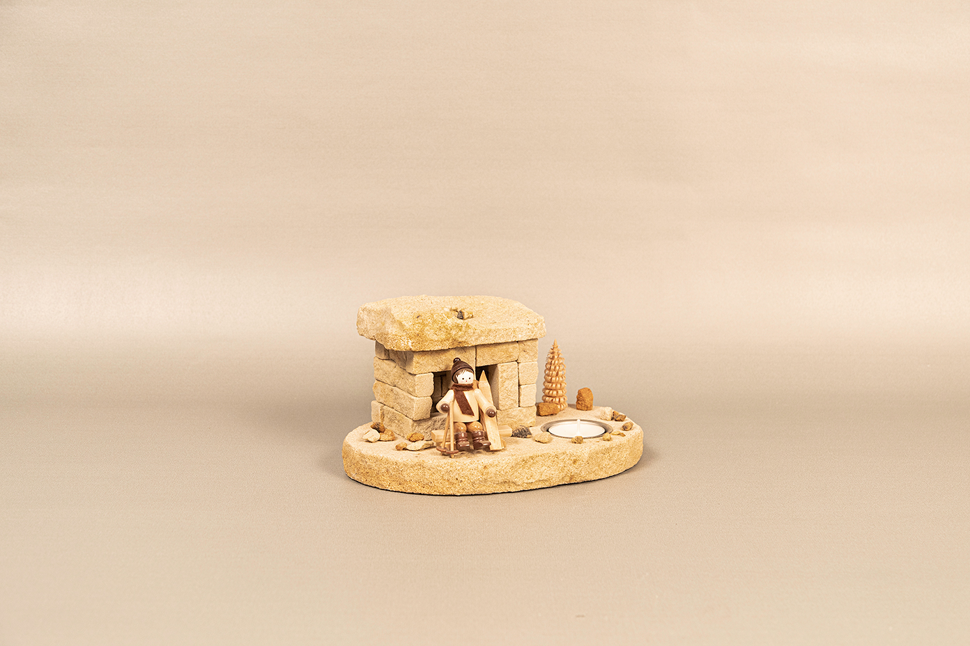 Räucherhaus „Schutzhütte“ der Steinbrecher in Steinbrüchen des Elbsandsteingebirges, Figuren aus Holz (Romy Thiel)